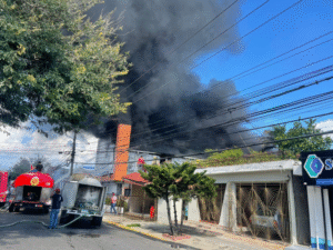 A los miembros del Cuerpo de Bomberos que están en el lugar se le ha dificultado controlar las llamas, ya que los productos que se