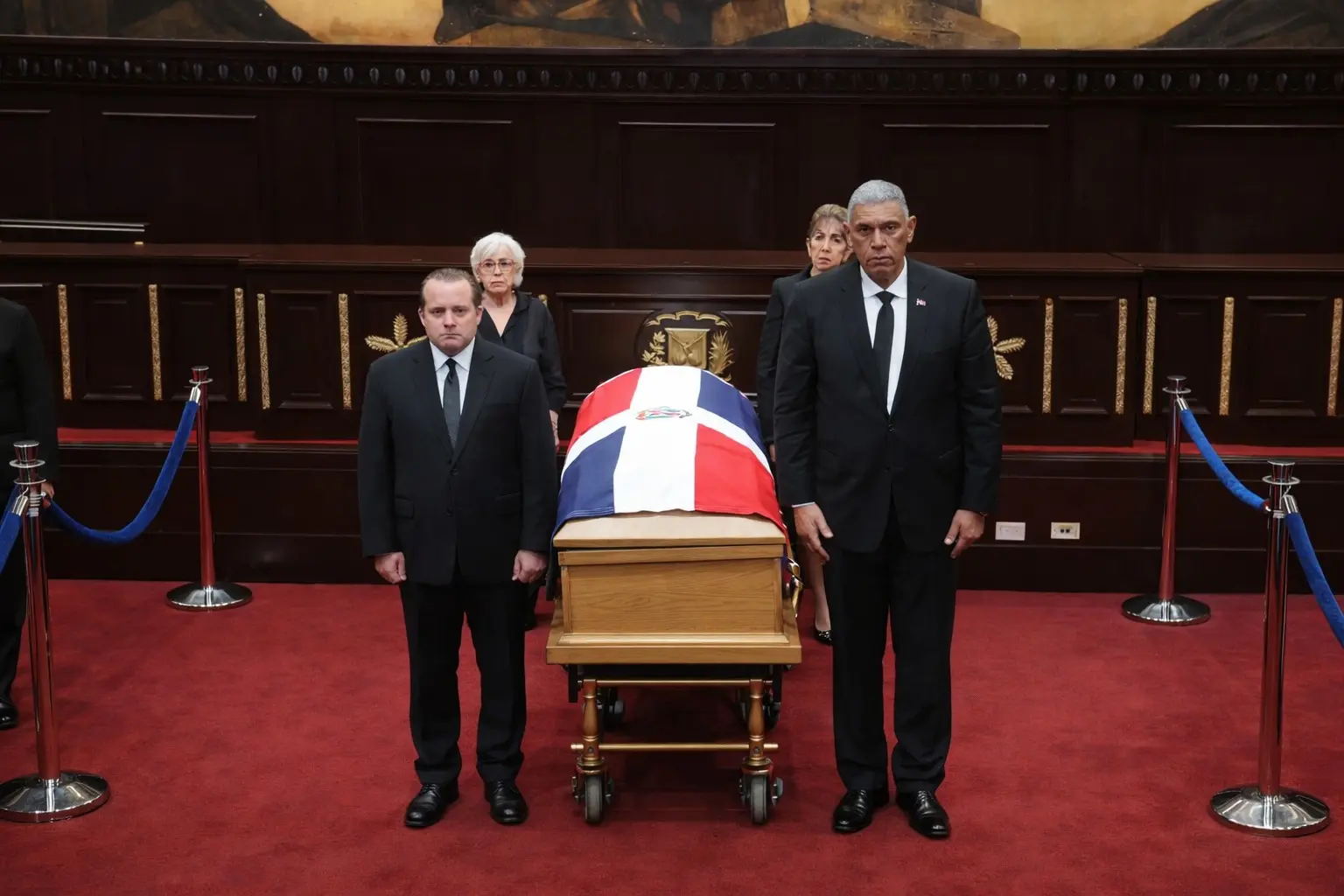 El momento más emotivo del día se vivió en el Salón de la Asamblea Nacional, donde el féretro fue expuesto de cuerpo presente. Allí, el presidente de la República, Luis Abinader, encabezó la primera guardia de honor junto a la vicepresidenta y los presidentes de ambas cámaras legislativas.